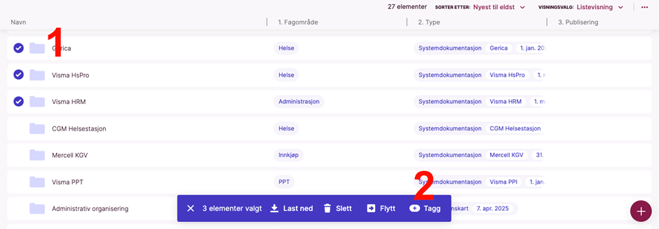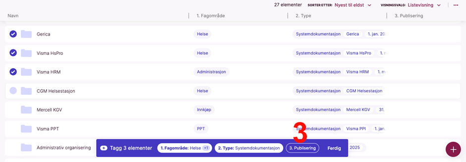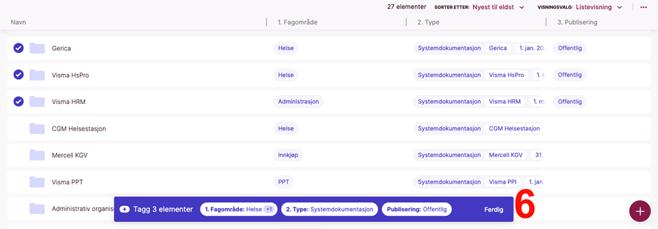 Innholdet du har markert og som nå er markert med “Offentlig” i kolonnen “Publisering” vil bli lagt ut i den offentlige portalen ved neste periodiske oppdatering.