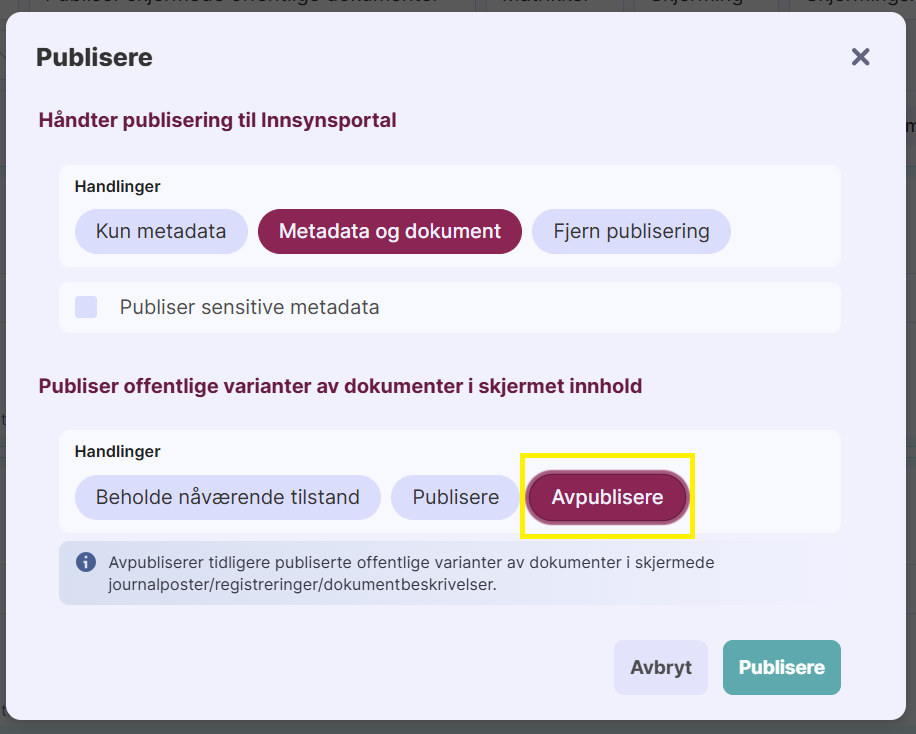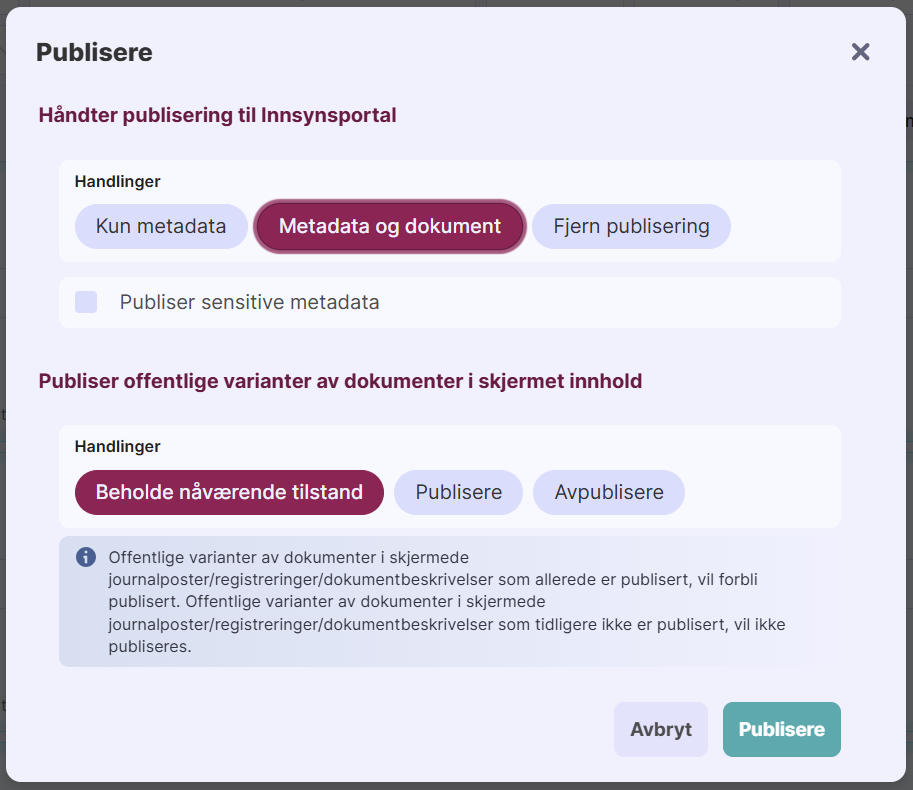 Hvis arkivet deres har funksjonalitet som produserer offentlige varianter av skjermede dokumenter, f.eks Documaster Request Hub, kan man i dette steget velge om man vil publisere de offentlige variantene av dokumentene (velg da Publisere), eller om man vil publisere registreringene slik at publikum må be om innsyn for å få tilgang til de (velg da Beholde nåværende tilstand).