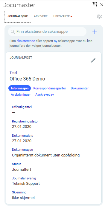När du har hittat eller skapat den saksmappe där journalposten ska registreras, kommer informationen att visas i fliken: