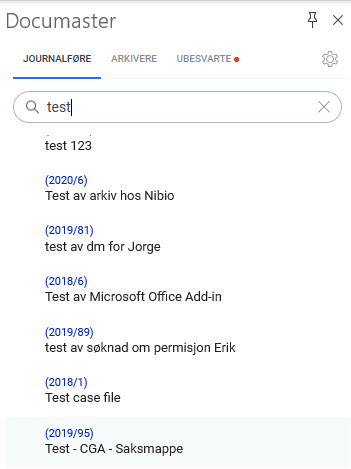 Om du vill använda en befintlig saksmappe kan du söka efter den genom att börja skriva i fältet "Sök efter befintlig saksmappe" högst upp. Tillägget kommer då att söka igenom Documaster baserat på det du skriver. Klicka på den saksmappe som är korrekt.