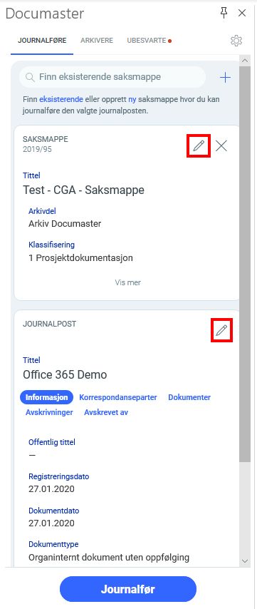 - Du kan redigera både saksmappar och journalposter genom att klicka på de röda blyantikonerna.