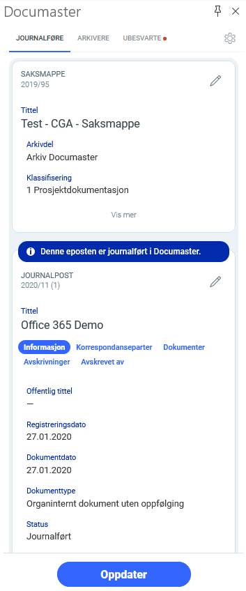 Texten "Detta e-postmeddelande har journalförts i Documaster" visas centralt i fliken i blått. Denna information kommer även att synas om du återvänder till e-postmeddelandet vid ett senare tillfälle.