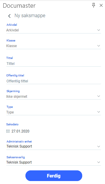 När du skapar en ny saksmappe från tillägget fyller du i den nödvändiga informationen i det fönster som visas nedan. Du kommer att se information som finns i Documaster i nedrullningsmenyerna. Klicka på "Färdig" när all information är korrekt ifylld.
