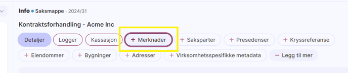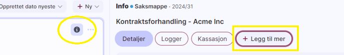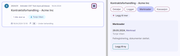 Om man behöver lägga till en kommentar på mapp, registrering eller dokument görs detta via sidomenyn när man är på objektet: Tryck på informationsknappen på objektet och välj 'Lägg till'.