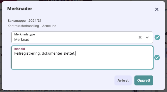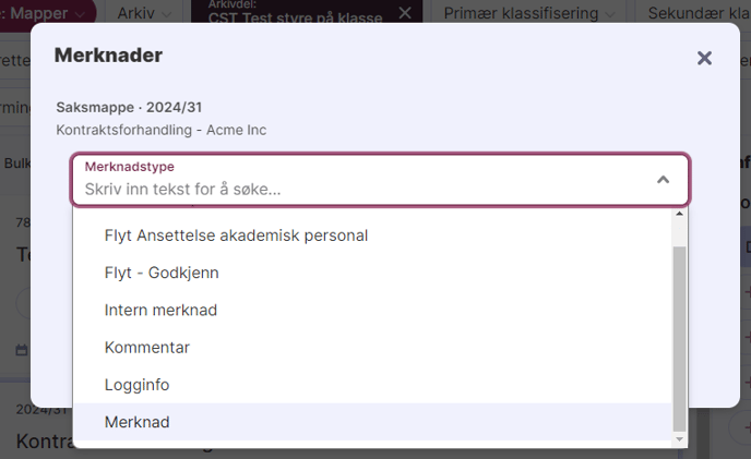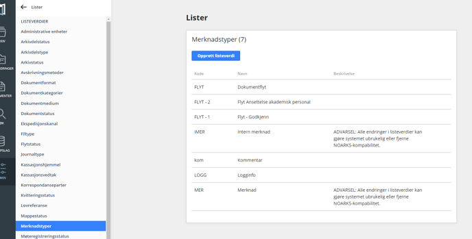 * Typ av anteckningar kan läggas till i listvärden under Typ av anteckningar. 'Anteckning' och "Intern anteckning' är standard för alla Documaster-installationer (NOARK5-standard), men fler kan läggas till vid behov.